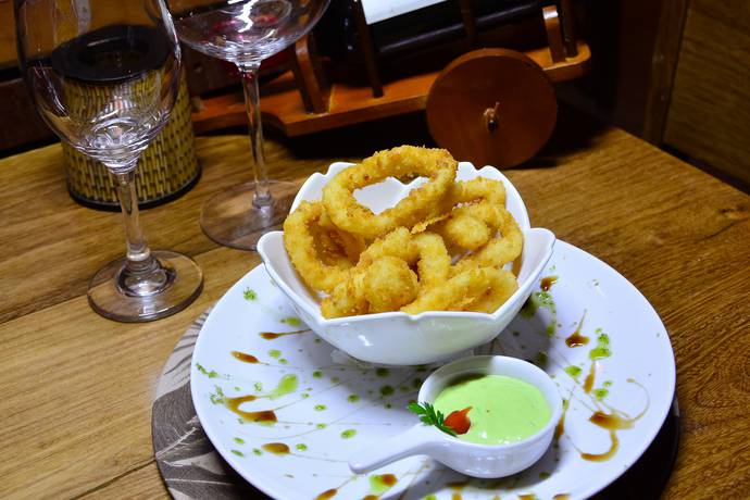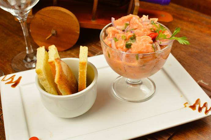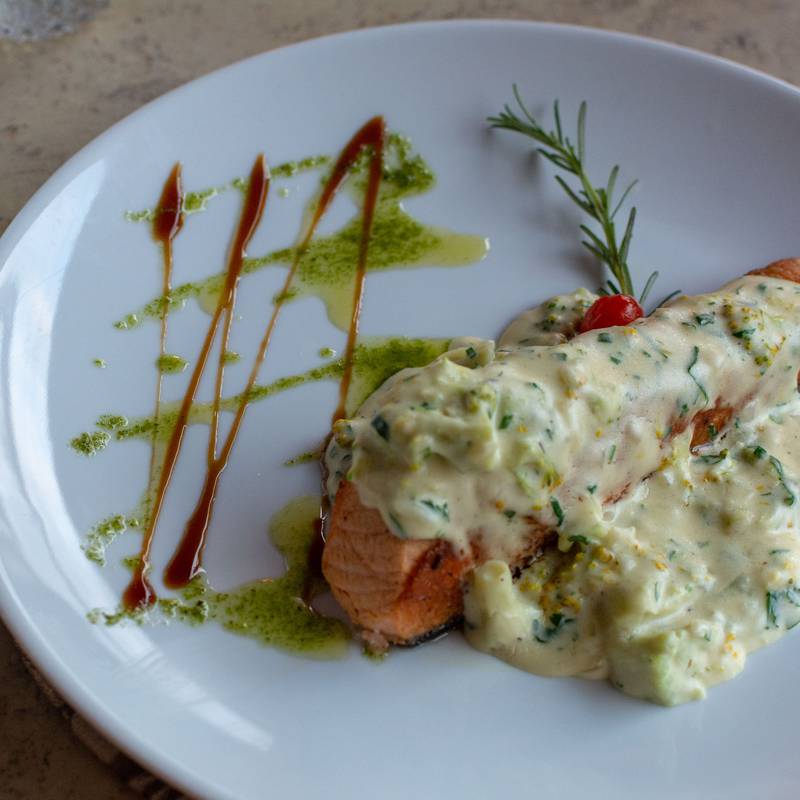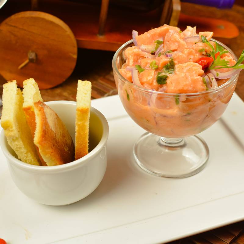 Salada de Abacate com Salmão Defumado, cebola Roxa e Alface.